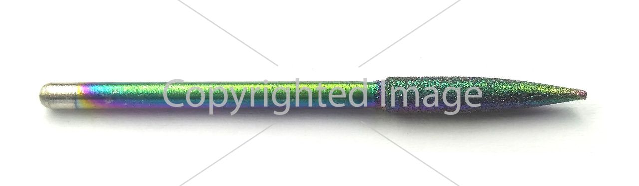 Фреза з алмазним напиленням Chameleo Diamond Burr F 10013 забарвлення Хамелеон, Конус (діаметр - 3 мм, w - 16 мм) підходить для чищення бічних валиків, обробки бічних синусів, шліфування нігтьової пластини перед нарощуванням і т.п.