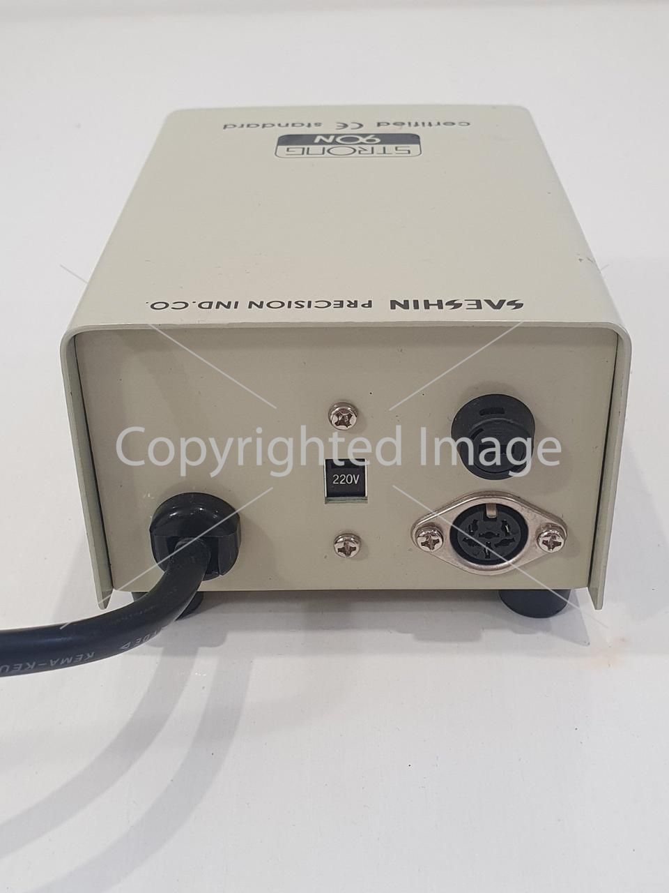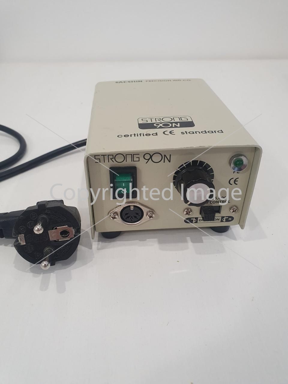 Компактний блок живлення в корпусі бежевого кольору і з твердого металу важить 1,2 кг і спереду має інтуїтивно зрозумілу, найпростішу панель управління, на якій є роз'єм для підключення до нього безпосередньо ручки-мікромотора. З зворотного боку розташоване гніздо з запобіжником і роз'єм для підключення піни ножної. Також він має стандартні для всіх блоків живлення Strong максимальний струм навантаження в 2 А та вихідну напругу DC 0-32 V.