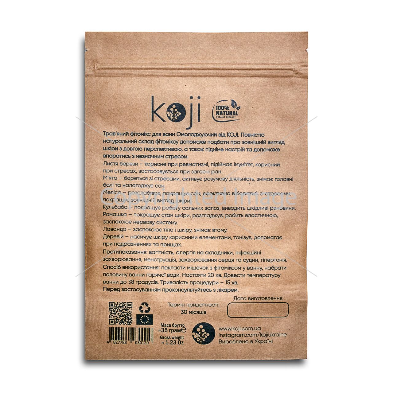 Набрати половину ванни гарячої води, покласти в неї мішечок фітомікса Koji. Наполягти 20 хвилин. Довести температуру води у ванній до 38 градусів. Тривалість процедури – 15 хв.
