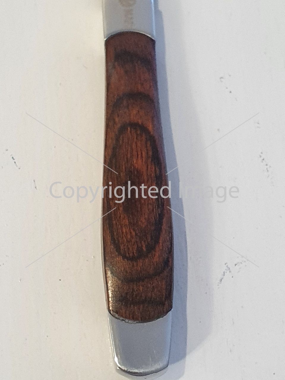 Якісний інструмент, виготовлений з нержавіючої сталі, на ручці декоративне покриття червоне дерево, що забезпечує зручність виконання процедури.