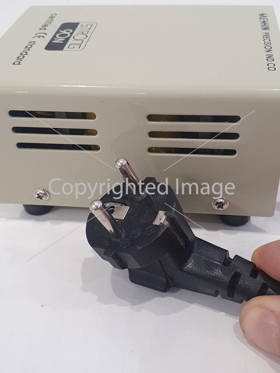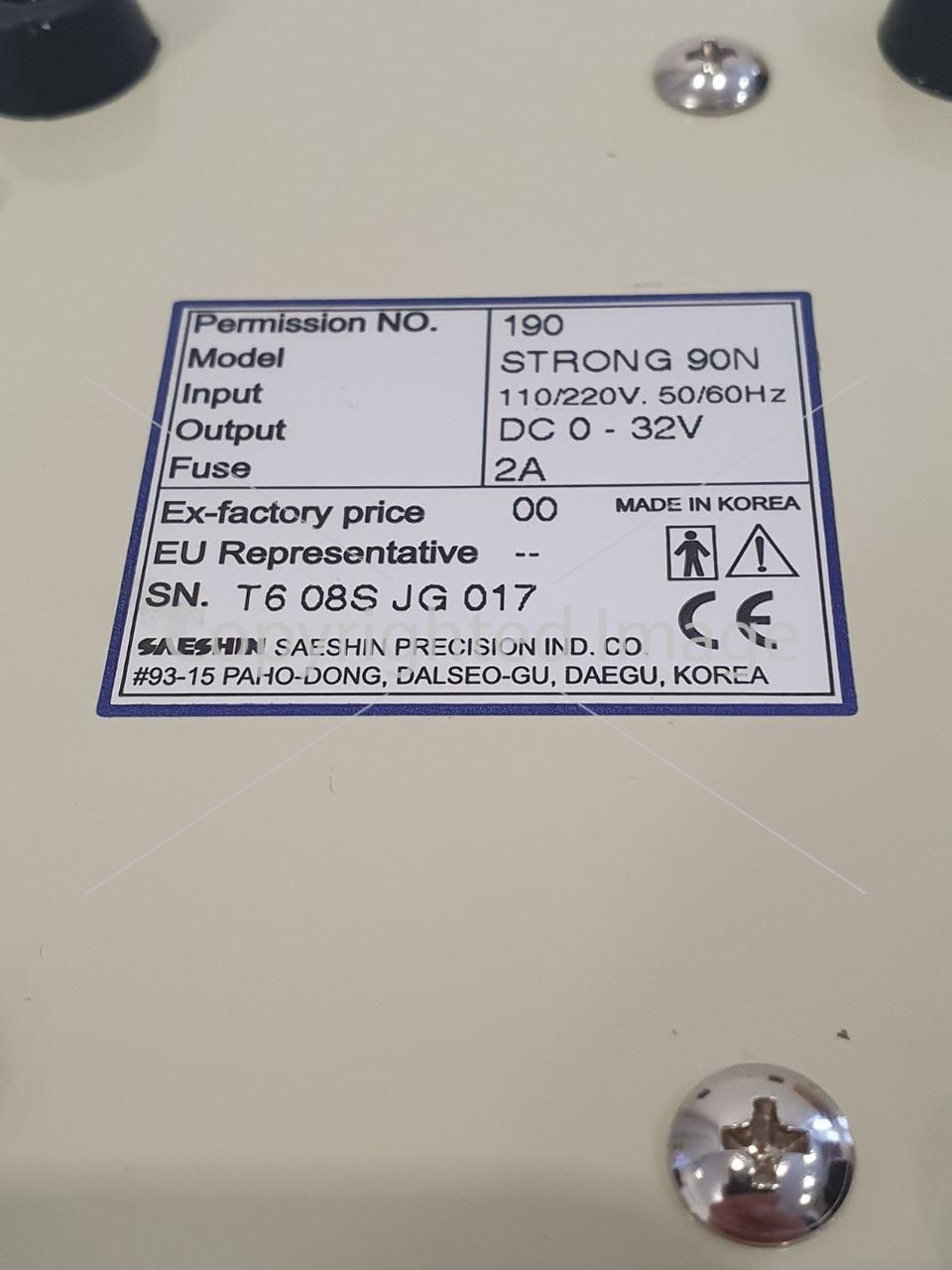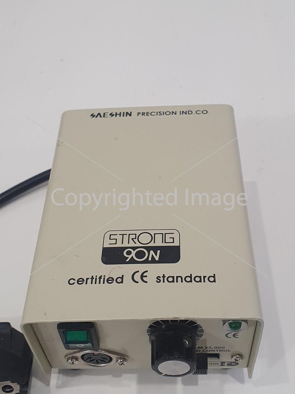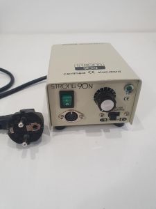 Компактний блок живлення в корпусі бежевого кольору і з твердого металу важить 1,2 кг і спереду має інтуїтивно зрозумілу, найпростішу панель управління, на якій є роз'єм для підключення до нього безпосередньо ручки-мікромотора. З зворотного боку розташоване гніздо з запобіжником і роз'єм для підключення піни ножної. Також він має стандартні для всіх блоків живлення Strong максимальний струм навантаження в 2 А та вихідну напругу DC 0-32 V.