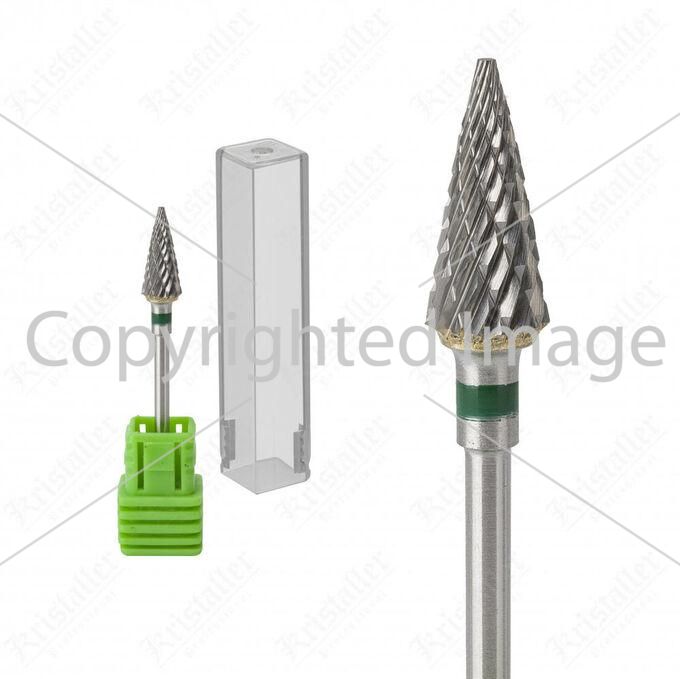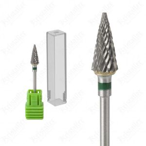 Твердосплавна фреза конус гострий із зеленою насічкою виготовлена з металу підвищеної твердості, з великою хрестоподібною насічкою, має високу міцність та довговічність, легко піддається дезінфекції та стерилізації.