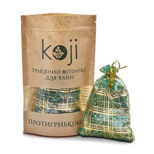 До складу фітоміксу Koji увійшли: морська сіль, чистотіл, ромашка, хвоя, календула, подорожник, лопух, полин, кора дуба.