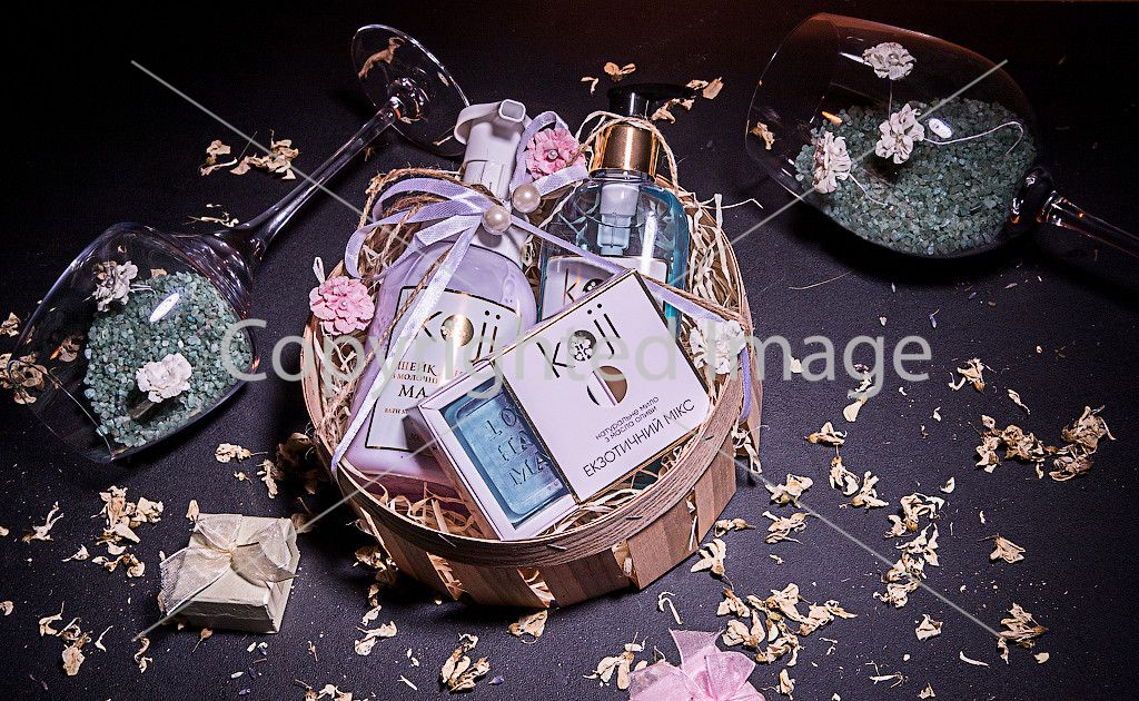 У подарунковий набір входить Рідке мило СПА, натуральне мило Екзотичний мікс, Шейк для тіла Малина.