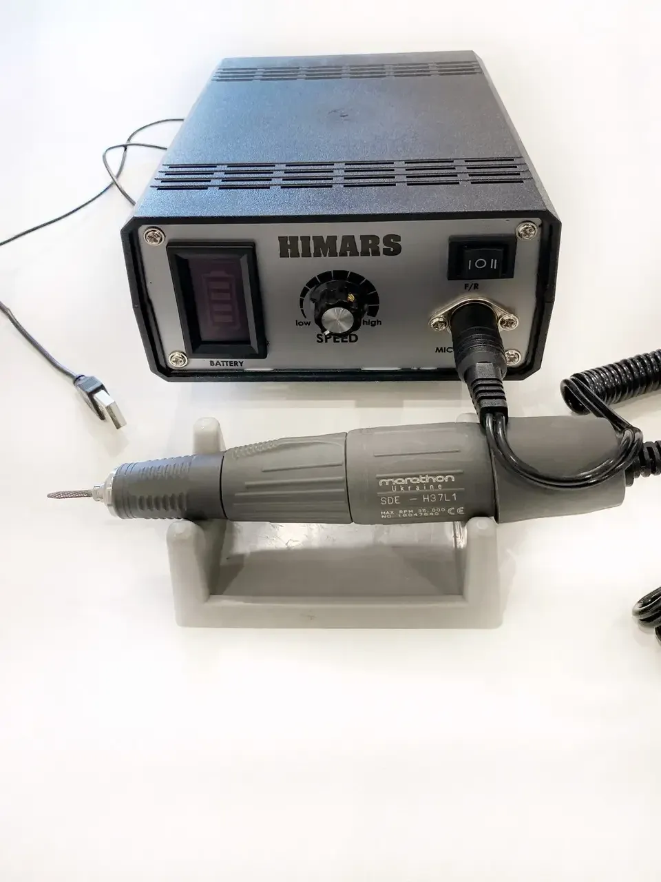 На корпусі розташовані: регулятор обертів мікромотора, перемикач реверсу, роз'єм для підключення ручки, USB-вихід для зарядки гаджетів. індикатор заряду акумулятора.